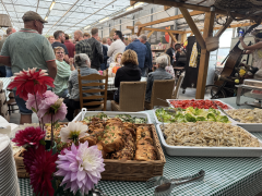 Toen een flinke regenbui losbarstte, verplaatste het gezelschap zich naar binnen. Daar volgde een toespraak van Richard Walkier en werd het buffet geopend. Er werd genoten van goed eten, fijne gesprekken en een warme sfeer.